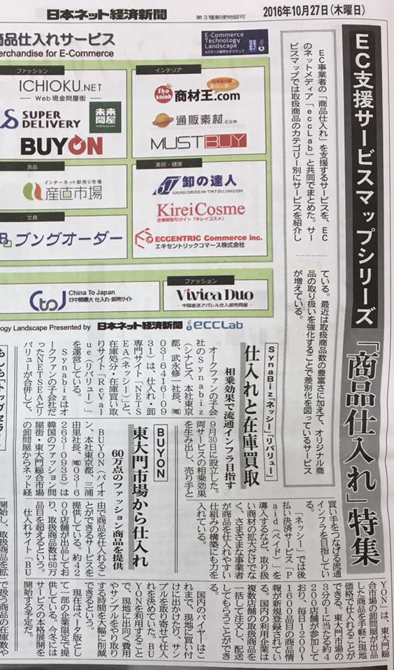 - 2016/12/06 日本流通産業新聞社 「日流ウェブ」 Eコマース業界カオスマップの仕入れ編に弊社サービスBUYONが掲載されました。